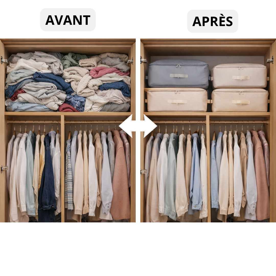« Incroyable ! J’ai rangé deux grosses couettes dans mon placard et il reste encore de la place. Hyper pratique et élégant en beige. »